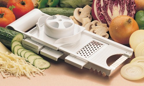 5 Blades are stored inside the grater, plus 4 sharp stainless steel interchangable blades for different uses. Safety food holder. All fits together in a nice neat package that measures 12X 5.5X 3 Inches. Fits nicely over bowl for less clean-up. Great for slicing shredding and cutting all vegetables or fruits.
