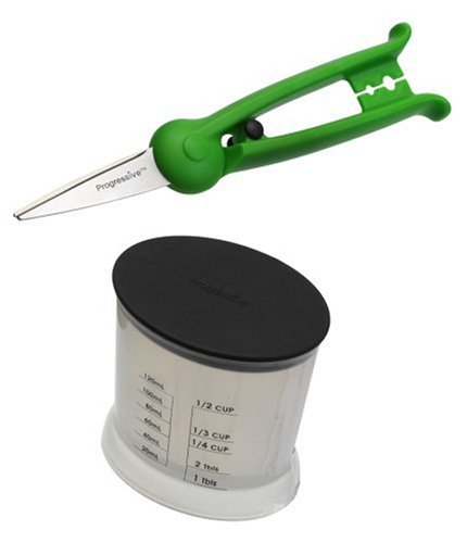 Progressive International is your source for the widest range of functional, inventive, and fun kitchen tools and great ideas put into practice. Our in-house designers spend hours in the kitchen coming up with ways to improve on a variety of traditional tasks and tools. Established in 1973, our commitment to quality and service allows us to offer a broad selection of quality kitchenware and other household products. The Herb Pro includes herb shears that are spring loaded and specifically designed to easily chop herbs to desired fineness. Sheering action will not bruise or tear delicate herbs. Great for parsley, oregano, basil and more. Stainless steel blades lock for safety. Includes a storage cup that measures up to 1/2 cup. The lid doubles as a non-stick base for measuring cup. Dishwasher safe.